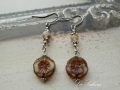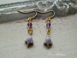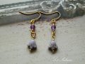 つやのある天然石アメジストには金茶の3カットグラスビーズ、乳白色がかった紫の6弁花のチェコガラスフラワービーズには仁丹メッキの特小ビースがさりげなく輝く上品なフックピアス。イヤリング、ステンレス、チタン、ブックマーカー他小物等、金具の変更可