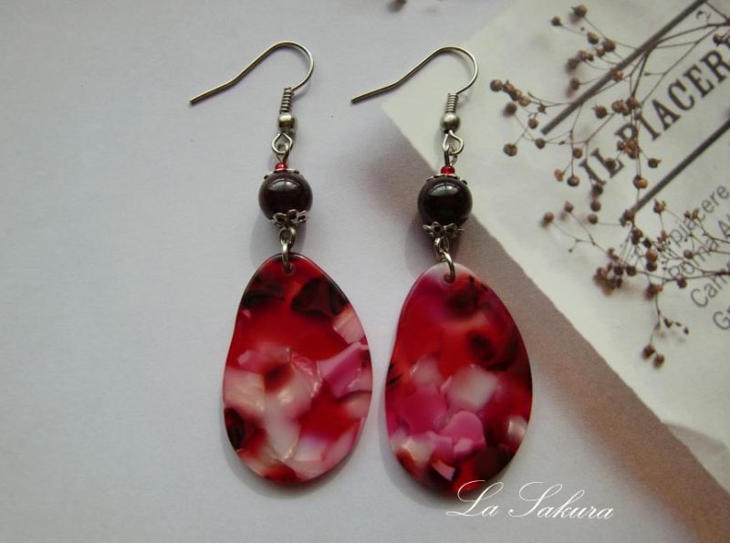 天然石ガーネットに透明な赤をベースに複雑な模様が美しいセルロイドアセテート製の花びらが揺れるフックピアス。花座と赤のグラスビーズで上品に。天然素材で出来たアセチパーツのペタルの模様は1つ1つ異なります。ガーネットは1月の誕生石。金具の変更可