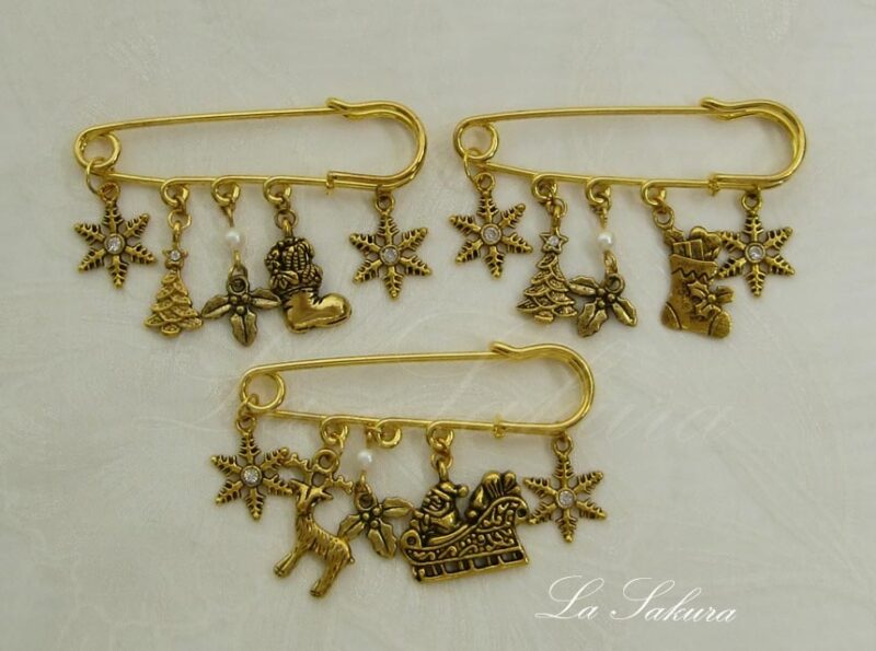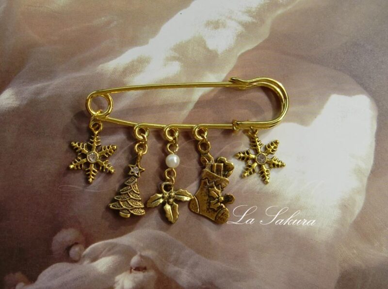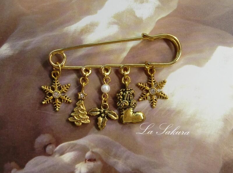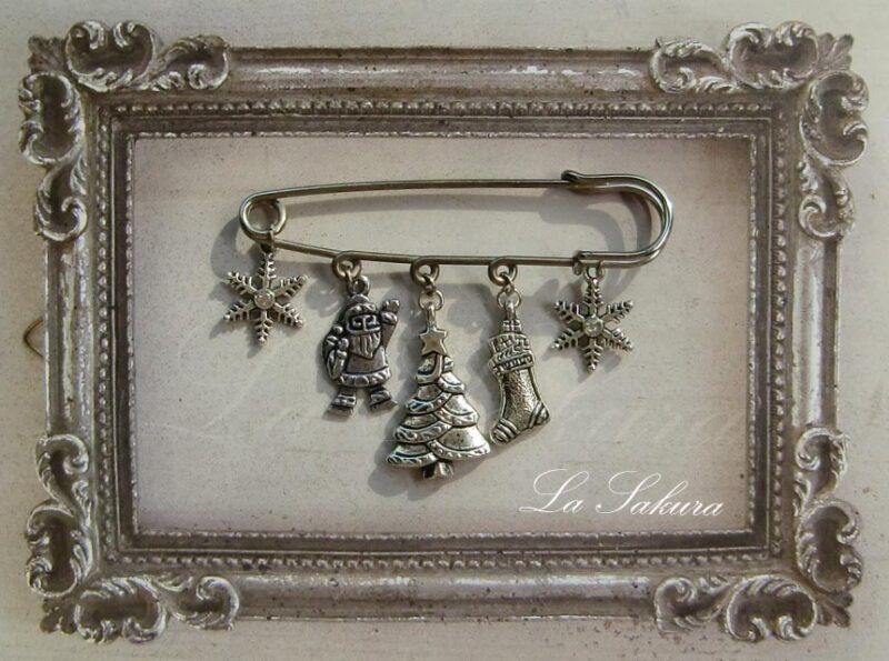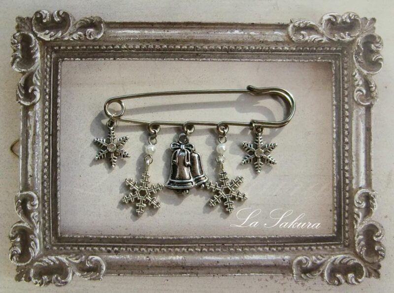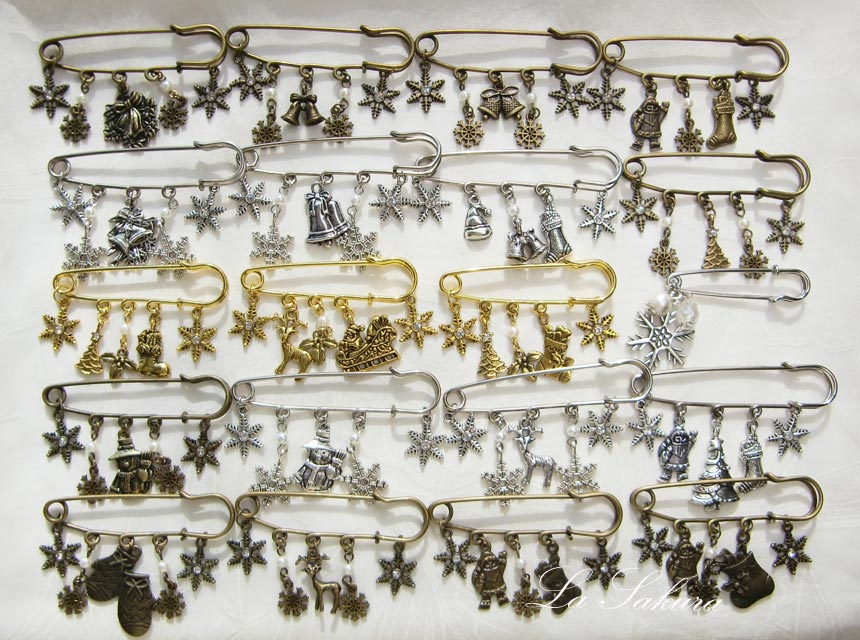 ベル、リース、サンタクロース、靴下、ブーツ、ミトン、スワロフスキー付クリスマスツリー、スノーマンなどのクリスマスチャーム、雪の結晶と樹脂パール、9種類のピンブローチ。クリスタル製Vカットストーンがキラキラ綺麗な雪の結晶は全種類につけました。