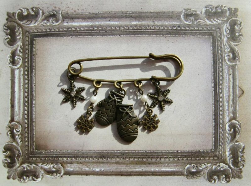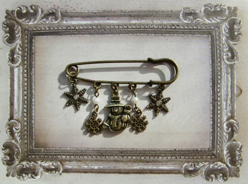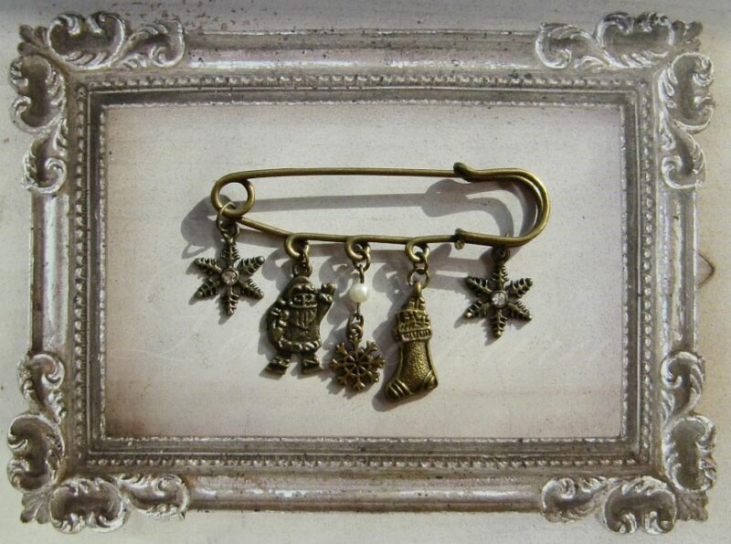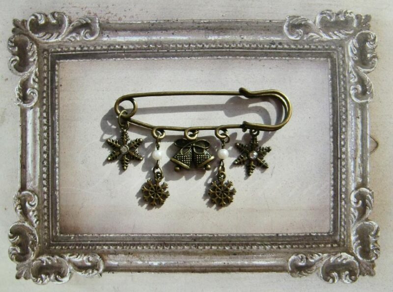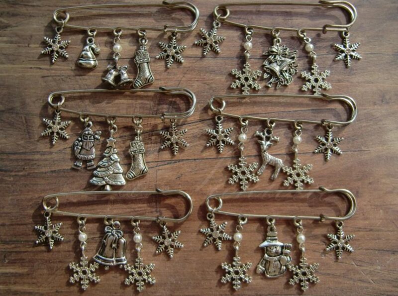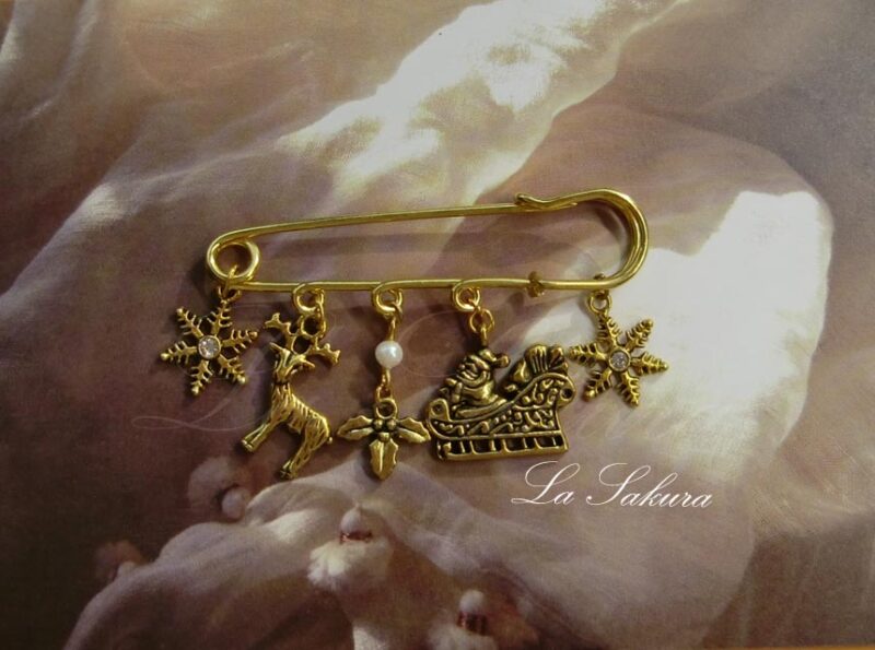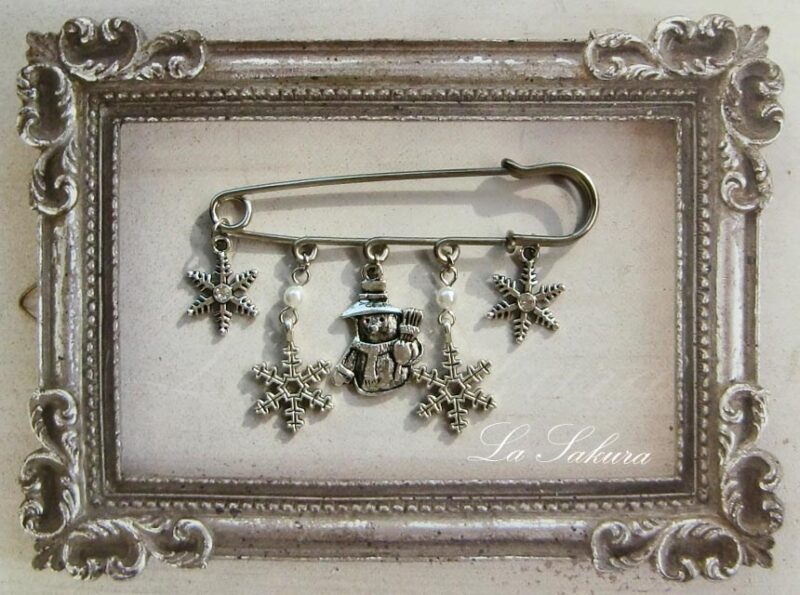 ベル、リース、サンタクロース、靴下、ブーツ、ミトン、スワロフスキー付クリスマスツリー、スノーマンなどのクリスマスチャーム、雪の結晶と樹脂パール、9種類のピンブローチ。クリスタル製Vカットストーンがキラキラ綺麗な雪の結晶は全種類につけました。