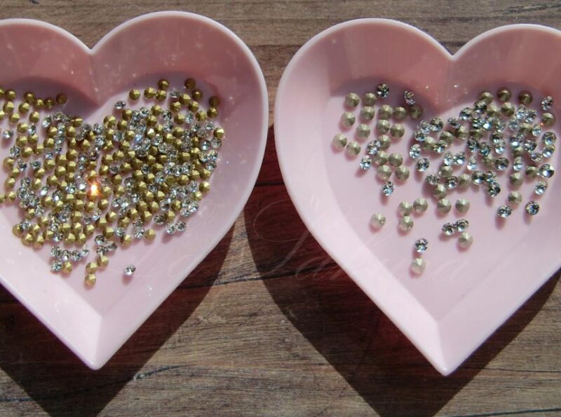 クリスタル製Vカットストーン(チャトン・ダイヤモンドカットストーン)について:ピンブローチの写真では分かりにくいのですが、両脇の雪の結晶のクリスタル製のチャトンはキラキラ輝いて綺麗です。ハートのトレイ左側が今回使用したクリスタル製のチャトン、右がスワロフスキーのチャトン。スワロより一回り小さいですが、同等に近い輝きだと思います。