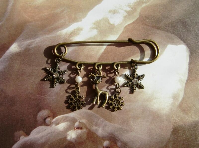 ショールピンの横幅約6.5cm。メタルパーツは傷や黒ずみ、変色を施したアンティーク加工のアンティークブラス(真鍮古美)です。トナカイは角とカンが離れたのでレジンで加工しておりパールチャーム1つ分値引きしました。