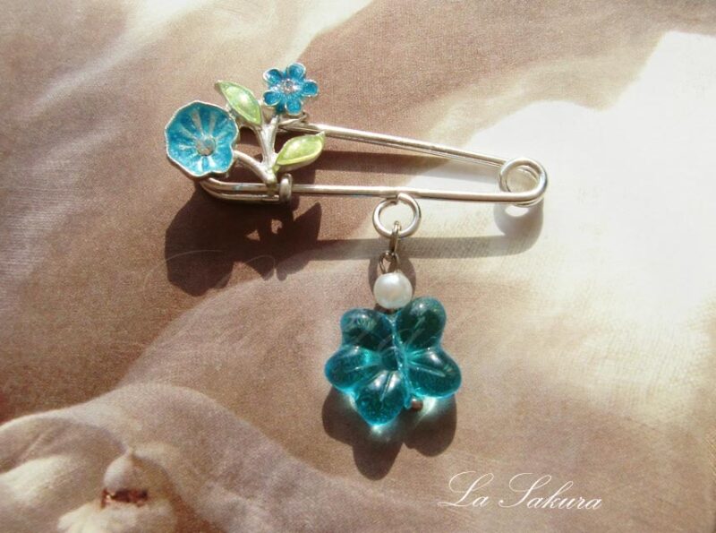 ボレロのボタン替わりやストールやマフラーを固定する実用品としてはもちろん、ジャケットやコートの襟、カーディガンの胸元、ポーチなどの飾りなどにどうぞ。爽やかな色合いの作品なので、春夏秋冬、オールシーズン使えます。