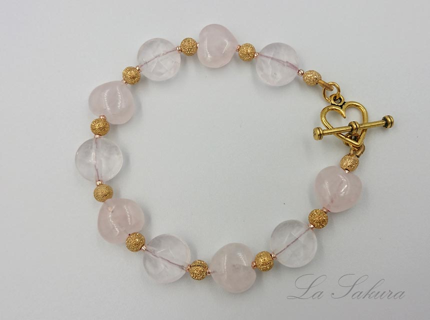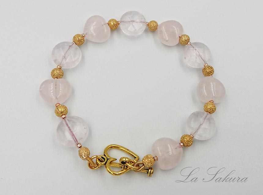透明に近いコインカット&多面カットのローズクォーツとミルキーカラーのころんとかわいいハート形のローズクォーツを交互に繋ぎました。マンテルはアンティーク仕上げのゴールド。ローズクォーツの間にはキラキラきれいなシュガーメタルビーズを挟みました。