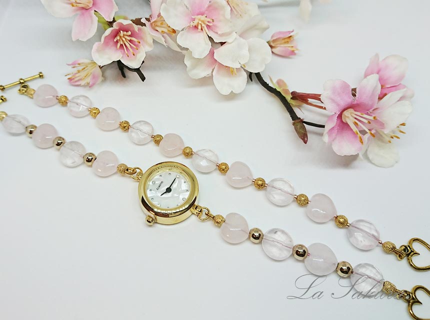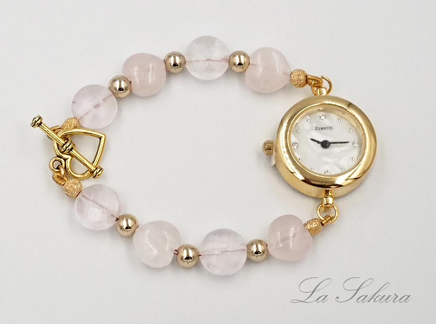 透明に近いコインカット&多面カットのローズクォーツとミルキーカラーのころんとかわいいハート形のローズクォーツを交互に繋いだブレスレットウォッチです。マンテルはアンティーク仕上げのゴールド。メタルビーズはのゴールドフィルドの高品質なものです。