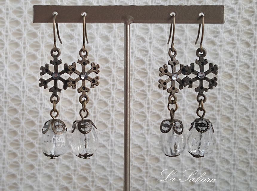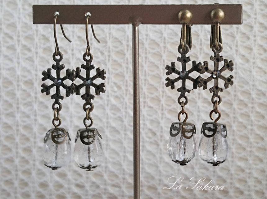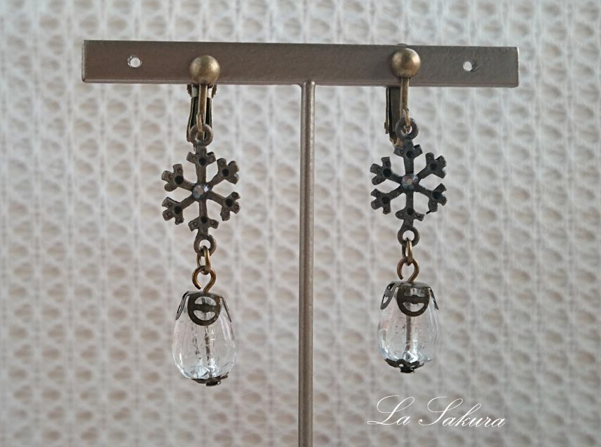 アンティークな雰囲気の雪の結晶のチャームに氷にひびがはいったような美しいアクリルビーズを繋ぎました。雪の結晶のチャームの真ん中にはスワロフスキーのラインストーンを、アクリルビーズにはチャームと同色の真鍮古美のビーズキャップと花座をプラスして統一感を出しました。