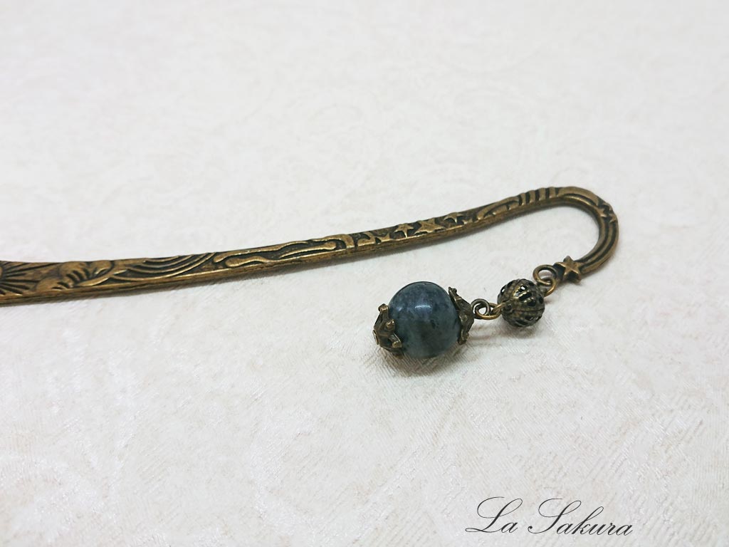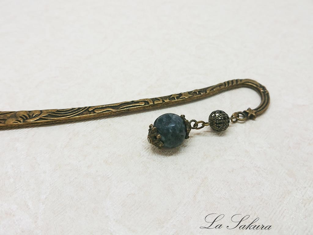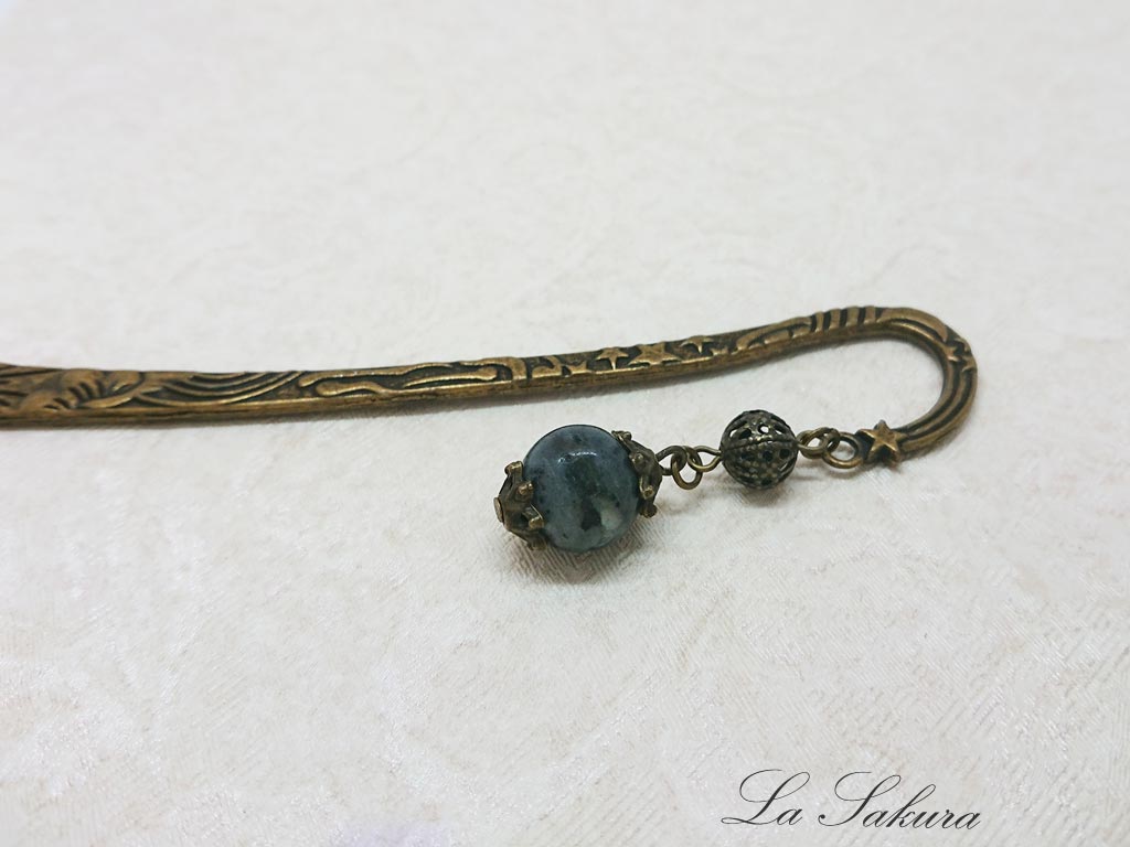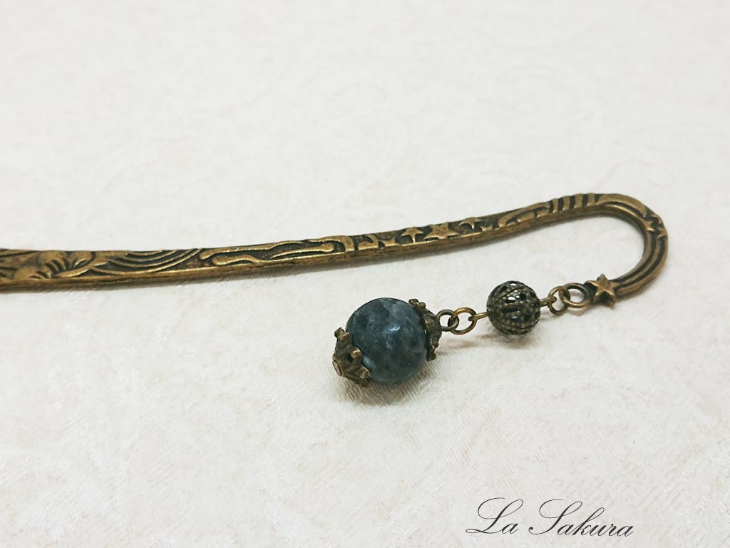 天然石はラルビカイト(月長石閃長岩)。黒とグレーのマーブルに神秘的な輝きのシラー効果のある鉱物が入っています。真鍮古美(アンティークブラス)カラーの金属製の栞は太陽と星の柄入り。簪や帯飾りとしても使えます。1点物で再販予定はありません。