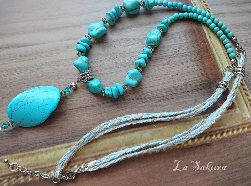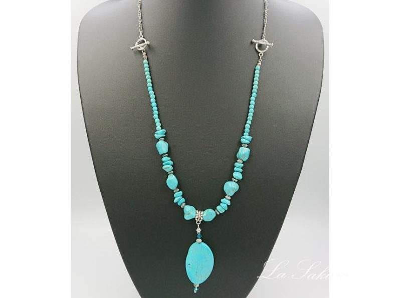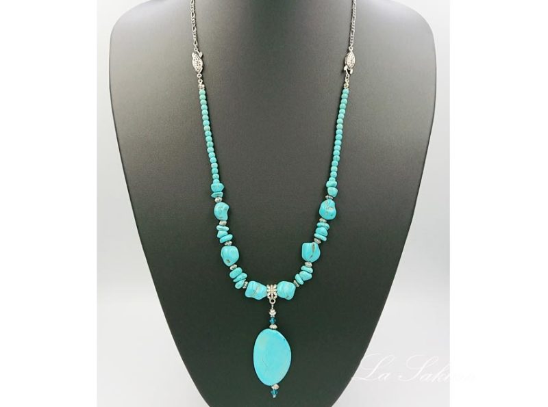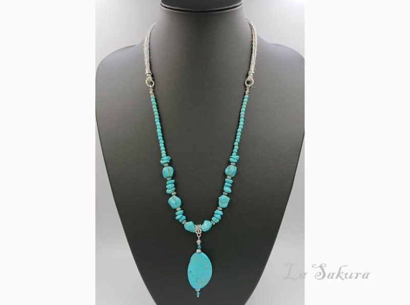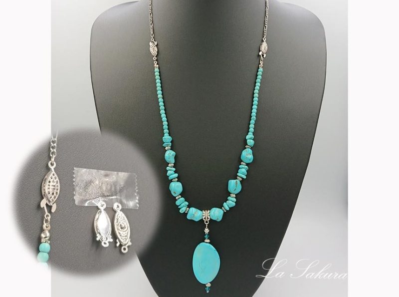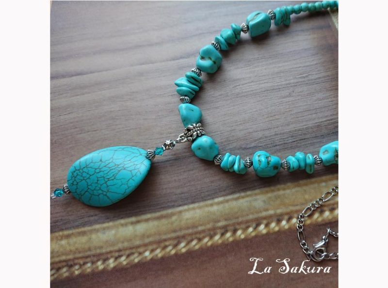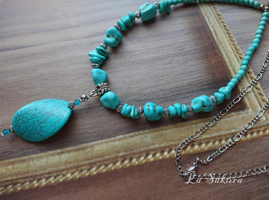 丸玉は人工ターコイズで5mmを使用。ペンダントトップは長さ約55mm、オーバルディスクは35×24×6mm。先端はMIYUKIのスリーカットグラスビーズ。着用サイズはアジャスター仕様で約61cm~65cm、マグネット仕様で約62センチ。メタルパーツは海外製の合金メッキ製で、キズや黒ずみを施したアンティーク仕上げの銀古美。